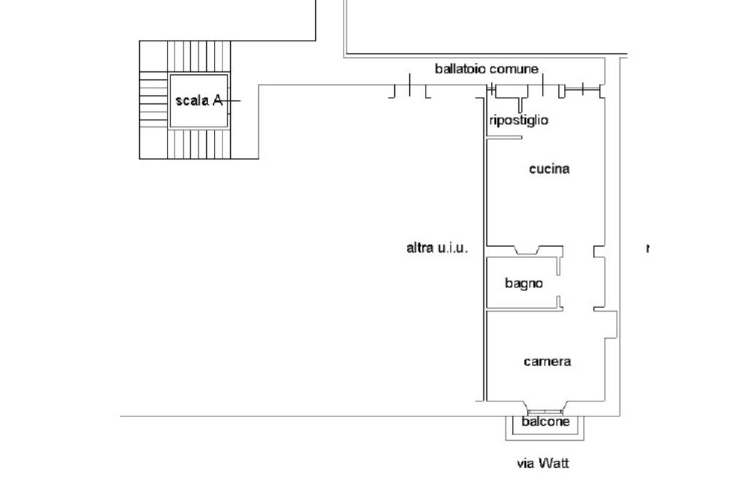 L'appartamento è situato al terzo piano. L'ingresso ci conduce direttamente alla zona giorno con cucina a vista attrezzata e munita di elettrodomestici. Il bagno è cieco con vasca e la camera da letto matrimoniale accogliente e luminosa con accesso ad un balconcino con affaccio su via Watt.